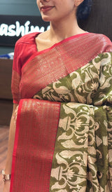 Grace meets vibrance in this beautifully Printed Chanderi Saree with a Banarasi Zari Border. Crafted from lightweight and airy Chanderi fabric, the saree features elegant all-over prints that add a contemporary flair to its traditional base. The addition of a rich Banarasi zari border enhances its appeal, blending subtle modernity with timeless heritage.