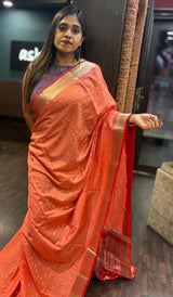 • Color Palette: The saree would typically come in vibrant colors such as deep reds, greens, golds, or rich maroons. These colors are often chosen to complement the natural sheen of the silk and highlight the beauty of the woven border.